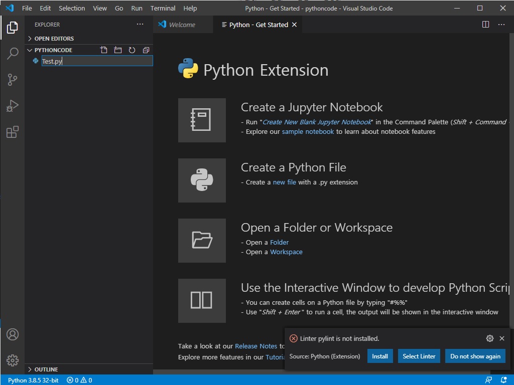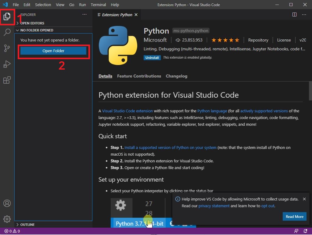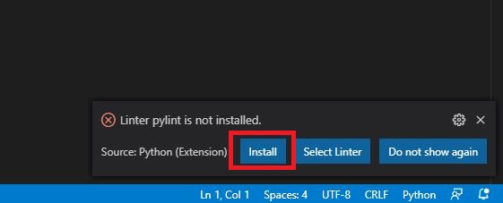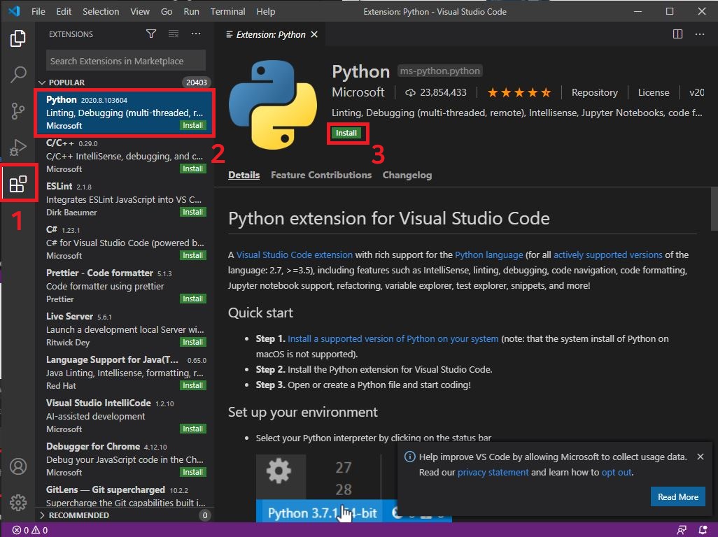 위 사진과 같이 왼쪽 사이드에서 5번째 버튼을 누르고 Python을 Install 합니다.