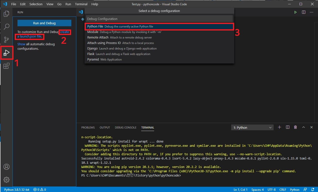 위와 같이 왼쪽 사이드 4번째 메뉴를 들어가서 create a launch.json file을 누르고 Python File을 누릅니다.