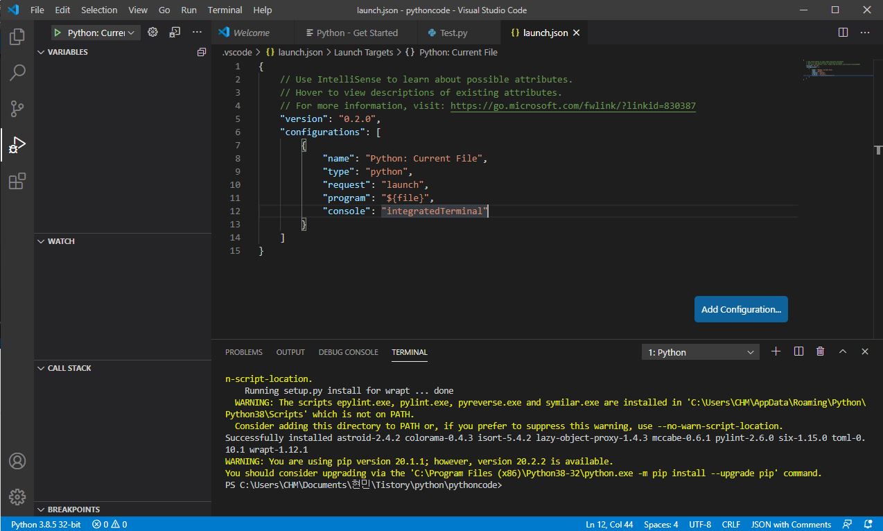 그럼 위와같이 launch.json 파일이 생성됩니다.