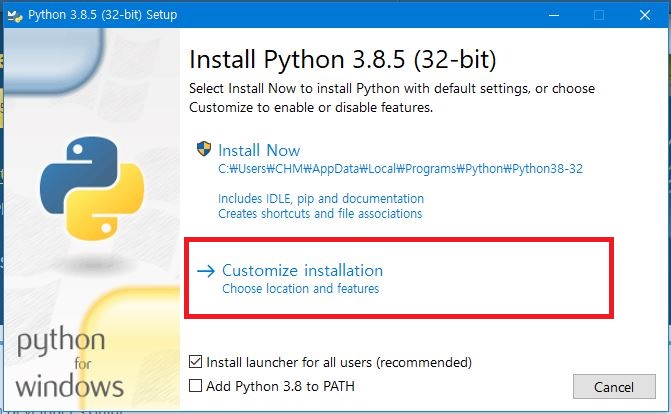 Customize installation을 누릅니다.