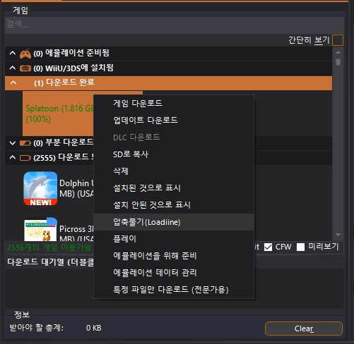 (CEMU 에뮬레이터를 이용하실 분들이라면 다운로드 완료 탭에서 다운이 완료된 게임을 우클한뒤 압축풀기(Loadline)을 눌러주시면 됩니다. 해당사항 없으시고 순전히 Wii U에 게임을 설치하실분들은 하지 말아주세요)