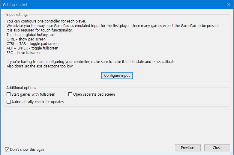 Configure input을 누르면 키보드의 키를 게임패드 조작으로 매핑할 수 있는 창이 나옵니다
